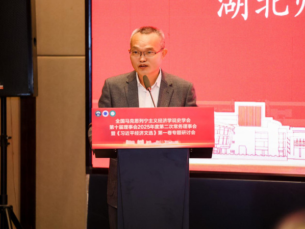 雷儒金首先代表湖北师范大学向与会嘉宾表示热烈欢迎。他指出,黄石是近代中国民族工业的重要发源地,也是资源型城市转型升级的“实验田”。他表示,学校正处于申博创优关键阶段,更需借力先进思想、拓展学术视野。学校将充分发挥地域优势与学科特色,把《习近平经济文选》第一卷的系统研究与黄石高质量发展实践紧密结合,为资源型城市“焕新”贡献学理支撑与决策参考,也恳请各位专家传经送宝,以多学科交叉碰撞激发灵感,把党的创新理论转化为推动老工业基地转型的强劲动力。