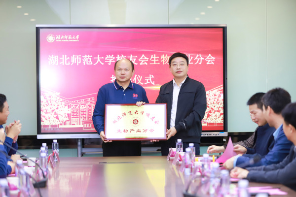 会上,秘书长陈俊雄介绍了校友会生物产业分会筹备情况,校友工作处处长陈敬道宣读了《关于同意成立湖北师范大学校友会生物产业分会的批复》,肖六亿为湖北师范大学校友会生物产业分会授牌。