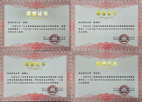 本网讯 近日,湖北省高校统战理论研究会第40次年会召开,会议对2025年湖北省高校优秀统战理论和工作实践创新成果进行了表彰。我校共有4篇论文获奖,其中二等奖1篇、三等奖1篇、优秀奖2篇,获奖数量位于全省高校前列。