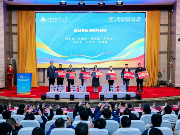 近日,湖北师范大学“中国国际大学生创新大赛(2025)总结暨2026年创新创业赛事动员部署会”在湖北师范大学教育大楼学术报告厅隆重召开,同期拉开第三届双创嘉年华活动序幕。校党委副书记、校长雷儒金,党委副书记、副校长余涛,黄石市教育局、科技局、人力资源和社会保障局相关领导、优秀校友企业家代表、湖北师范大学相关职能部门及二级学院负责人、获奖师生代表等齐聚一堂,共话双创教育发展,共启赛事新篇章。