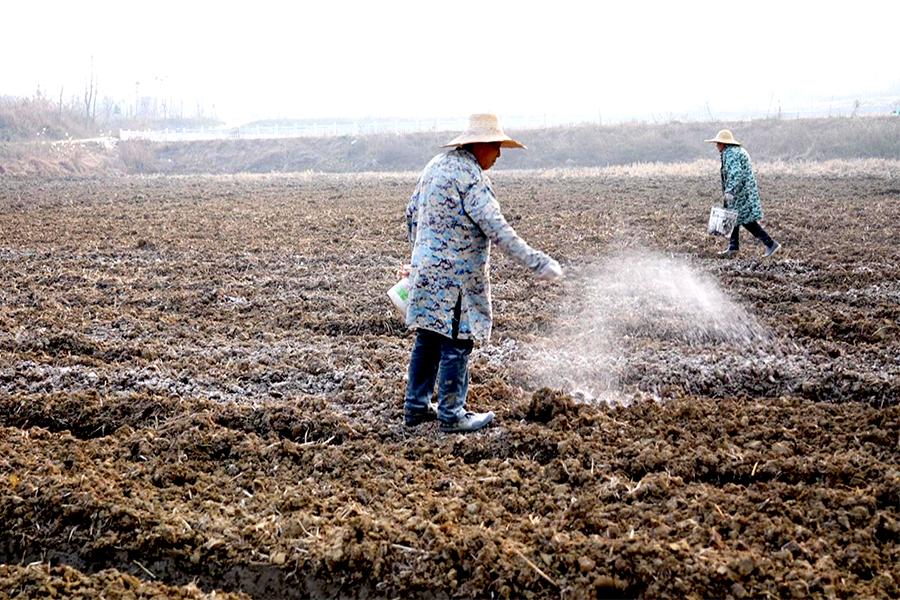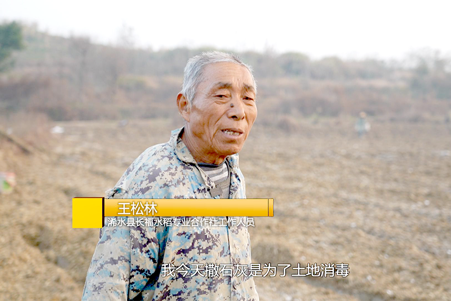 浠水县长福水稻专业合作社工作人员 王松林:今天撒石灰是为了给土地消毒,6亩地基本上撒完了。