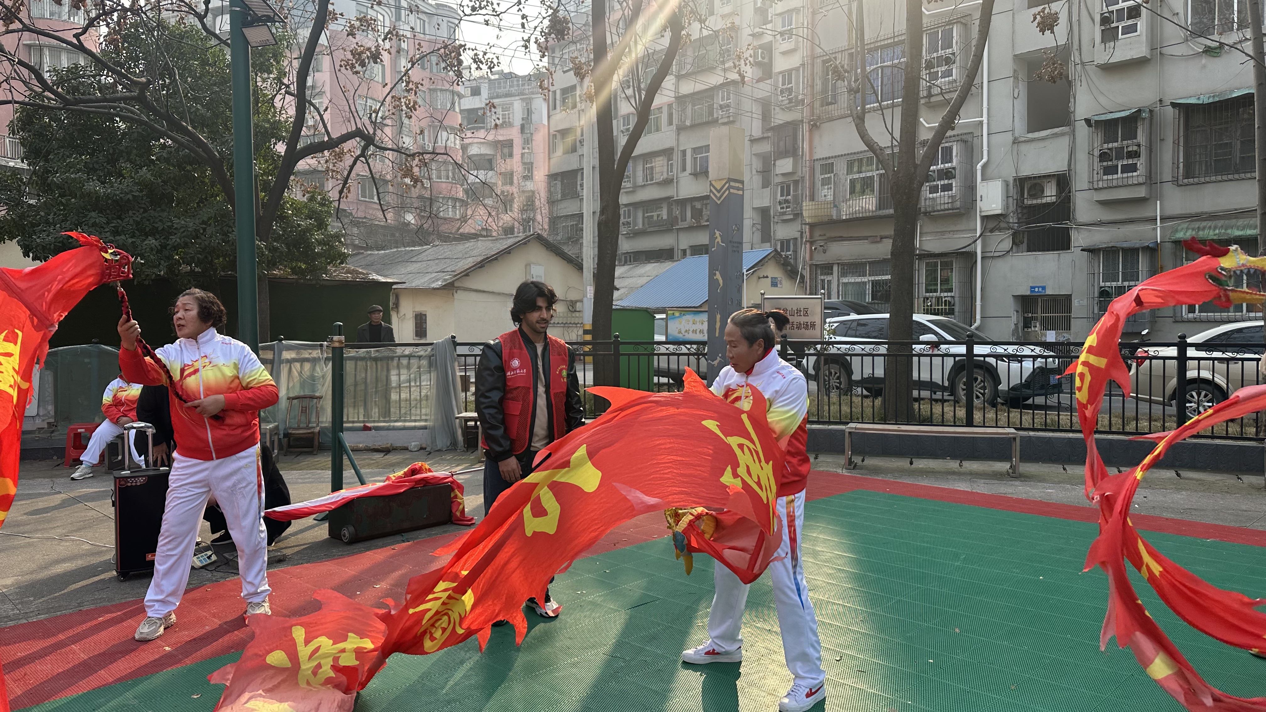 除了舌尖上的碰撞,现场更有文化与情感的深度交融。在社区精英舞龙队老师们的耐心指导下,留学生们手持非遗彩带龙道具,认真学习甩动、缠绕、盘旋等基础技巧,色彩艳丽的彩带龙随动作灵动翻飞,兼具观赏性与趣味性。他们在一招一式的练习中,沉浸感受这项非遗民俗的独特魅力,亲身体悟春节的喜庆氛围与中华文化的深厚底蕴。交流中,留学生们还分享了在中国的学习生活趣事,讲述对黄石这座城市的喜爱,精英舞龙队的老师和社区居民还向留学生细致讲解了春节习俗与非遗彩带龙舞的文化寓意。