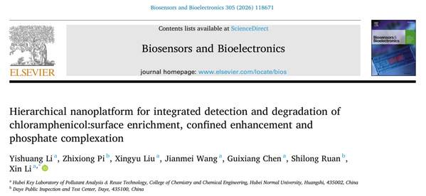 4月,Biosensors and Bioelectronics(《生物传感器和生物电子学》)发表了该团队又一研究成果。论文题为“Hierarchical nanoplatform for integrated detection and detoxification of chloramphenicol:surface enrichment, confined enhancement and phosphate complexation”(表面富集、限域增强与磷酸盐络合的氯霉素检测与降解一体化分级纳米平台)。2022级硕士研究生李艺爽为论文第一作者,李新副教授为通讯作者,湖北师范大学为唯一通讯单位。Biosensors and Bioelectronics是ELSEVIER出版社旗下国际知名期刊,SCI中科院大类一区,最新影响因子为10.5。