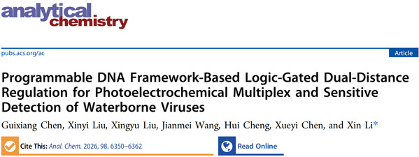 2月,Analytical Chemistry(《分析化学》)在线发表该团队题为“Programmable DNA Framework-Based Logic-Gated Dual-Distance Regulation for Photoelectrochemical Multiplex and Sensitive Detection of Waterborne Viruses”(可编程DNA框架逻辑门赋能双重距离调控PEC多元灵敏检测水环境病毒)的研究论文。2023级硕士研究生陈桂香为论文第一作者,李新副教授为通讯作者,湖北师范大学为论文唯一通讯单位。Analytical Chemistry是American Chemical Society(美国化学会)出版社旗下收录分析化学领域相关研究成果的顶级期刊,中科院SCI化学大类一区期刊、自然指数期刊,最新影响因子为6.7。