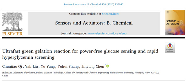 3月,Sensors and Actuators B: Chemical(《传感器与执行器B:化学》)在线发表该团队研究成果,论文题为“Ultrafast green gelation reaction for power-free glucose sensing and rapid hyperglycemia screening”(超快绿色凝胶化反应用于无供能葡萄糖检测与高血糖快速筛查)。该院2022级硕士研究生齐春娇为论文第一作者,陈金阳副教授为论文通讯作者,湖北师范大学为论文唯一通讯单位。Sensors and Actuators B: Chemical是Elsevier出版社旗下传感器领域权威期刊、中科院化学大类一区TOP期刊,最新影响因子为7.7。