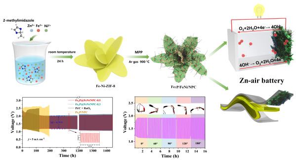 金属空气电池因其高比能量与环境友好性,被视为下一代储能技术的重要方向。但其核心难题在于正极侧需要同时具备高效ORR与OER的低成本双功能催化剂,并在长期充放电循环中保持稳定结构与活性。传统非贵金属催化剂常面临活性位点难以兼顾、结构易失稳等瓶颈。基于此,本研究合成了一种被碳基网络限域的Fe2P/FeNi 异质纳米结构复合材料(Fe2P/FeNi/NPC),形成高密度中等自旋 Fe(III)-N₄ 活性位点,FeNi/Fe₂P 异质纳米结构和碳纳米管导电网络耦合,使材料兼顾了高活性、快速传输与高稳定性三要素。组装的可充电锌空气电池(ZAB)表现出 755.08 mAh g-1 的高比容量、0.79 V 的低充放电电压差以及超过 1400 h 的卓越循环稳定性。结合原位拉曼光谱和第一性原理计算,研究揭示了中间自旋态 Fe(III)-N₄ 位点的电子结构调控机制,该自旋态可优化Fe-3d 电子的离域性与自旋极化效应,从而平衡*OH、*O、*OOH 等反应中间体的吸附与解吸过程,显著提升双功能氧电催化活性。该成果系统阐明了自旋态调控与异质结构协同对非贵金属催化剂性能增强的作用机制,为设计高效稳定的 Fe-N-C 系催化剂提供了新的思路。