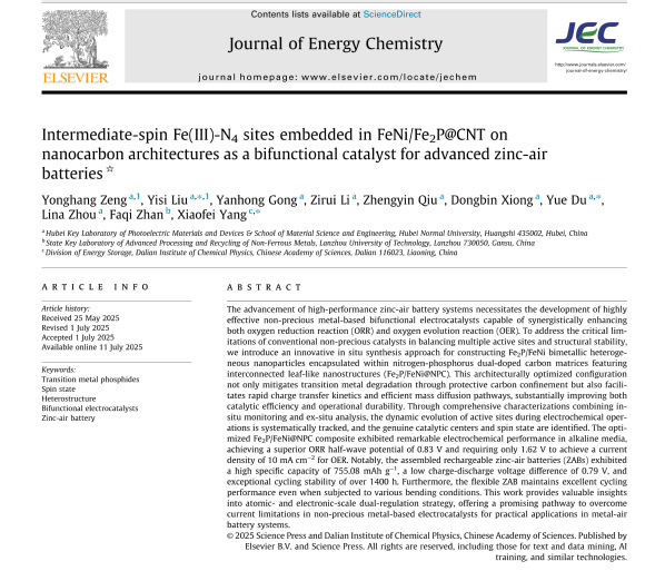 本网讯 近日,我校材料科学与工程学院刘易斯博士团队在金属空气电池氧电催化剂研究方面取得重要进展。相关研究成果以“Intermediate-Spin Fe(III)-N₄ Sites Embedded in FeNi/Fe₂P@CNT on Nanocarbon Architectures as a Bifunctional Catalyst for Advanced Zinc-Air Batteries”为题发表在国际知名期刊Journal of Energy Chemistry上。该期刊由中国科学院大连化学物理研究所与科学出版社主办,在能源化学、催化与电化学等交叉领域具有重要学术影响力,影响因子为14.9,中科院一区TOP。