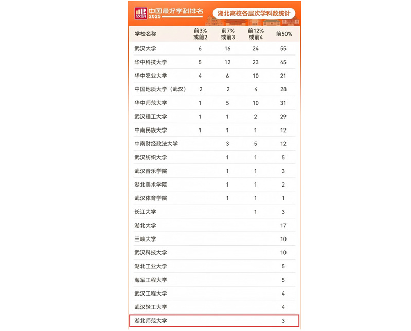 据悉,2025软科中国最好学科排名涵盖98个一级学科和5个专业学位类别,排名对象为全国具有研究生学位授权点的高校。其排名数据全部来自教育部、科技部、国家自然科学基金委员会等权威机构,通过人才培养、平台项目、成果获奖、学术论文、高端人才等五大类指标进行综合评价。此次湖北省共有26所高校的311个学科上榜“2025软科中国最好学科排名”,其中,包括84个中国一流学科、20个顶尖学科和6个冠军学科。