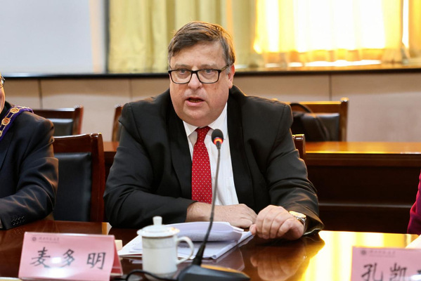 在欢迎座谈会上,雷儒金代表学校对麦多明总领事一行的到访表示热烈欢迎,并深情回顾了学校与英国北爱尔兰地区长达十余年的卓有成效的合作历程。他指出,自2012年与奥斯特大学合作建立北爱尔兰首家孔子学院以来,该院已茁壮成长为全球最具影响力的“十大孔子学院”之一,成为中英人文交流与教育合作的重要典范。他表示,学校将继续深耕“汉语+文化+职业技能”融合发展体系,积极探索共建联合实验室、开展研究生联合培养等合作新范式,为两地青年成长与区域发展注入新动能。