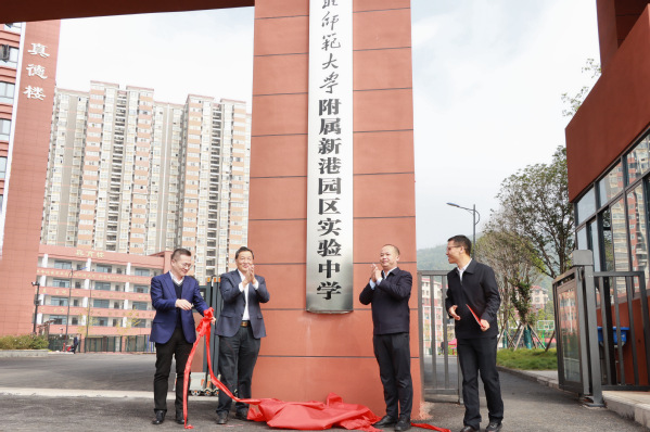 在黄石新港实验中学师生代表的共同见证下,程艳民、梅浩、雷儒金、胡艳军为“湖北师范大学附属新港园区实验中学”揭牌。