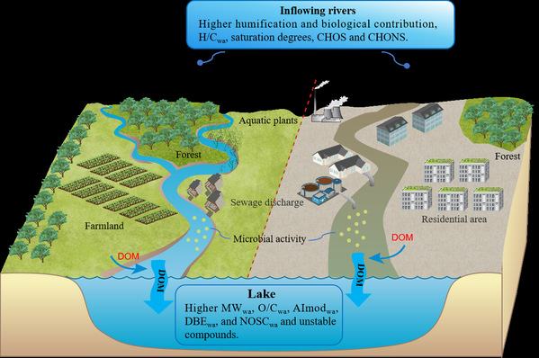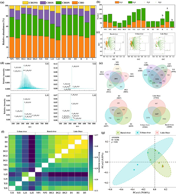 2022年夏季,长江流域遭遇了自1961年有完整气象观测记录以来最严重的干旱,正常汛期出现极低水位。为探究汛期前的极端干旱是否会显著改变河湖连续体中的溶解性有机质(DOM)循环,研究团队通过稳定同位素、三维荧光结合平行因子分析和傅立叶变换离子回旋共振质谱(FT-ICR MS)等手段,对汛期前极端干旱下,入湖河流与大冶湖DOM的性质和组成差异进行了探究。结果表明,大冶湖及其主要入湖河流DOM均来源于陆源,乡村河流对大冶湖陆源DOM贡献更大。荧光DOM中鉴定出2个类腐殖质组分(C1和C3)和1个类蛋白质组分(C2),其中C1和C2为主要荧光组分。与大冶湖相比,入湖河流(特别是城市河流)具有较高的氢碳比和饱和度,但具有较低的分子量、氧含量、芳香度和热力学不稳定性。微生物活动主导了大冶湖流域水生连续体中DOM的动态变化。大量的人类活动影响了入湖河流中的含硫组分,并进一步影响大冶湖DOM。与废水相关的不稳定化合物通过入湖河流输入大冶湖,城市河流的贡献尤为突出。因此,即使在极端干旱条件下的非汛期,入湖河流仍然会影响大冶湖DOM的组成和特征。该研究成果对大冶湖流域水环境管理具有指导意义。