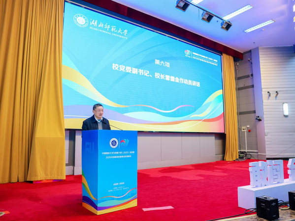 本网讯 近日,湖北师范大学“中国国际大学生创新大赛(2025)总结暨2026年创新创业赛事动员部署会”在学校教育大楼学术报告厅隆重召开,并同期拉开第三届双创嘉年华活动序幕。校党委副书记、校长雷儒金,党委副书记、副校长余涛,黄石市教育局、科技局、人力资源和社会保障局相关领导、优秀校友企业家代表、学校相关职能部门及二级学院负责人、获奖师生代表等齐聚一堂,共话双创教育发展,共启赛事新篇章。