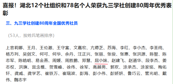 近年来,屈小妹老师作为九三学社湖北师范大学委员会主委,在立足本职工作的同时,围绕社中央和省委省政府中心工作,面向地方经济社会发展需求,结合高等教育发展实际,深入调查研究,积极建言献策,主持各级各类调研课题多项,撰写高质量提案及信息数篇,多次获评九三学社湖北省“模范社员”“参政议政先进个人”“优秀信息员”等荣誉,所在九三学社湖北师范大学委员会多次获评九三学社省、市级“先进基层组织”,委员会社员也多次获得省、市级表彰。(通讯员 张艳)