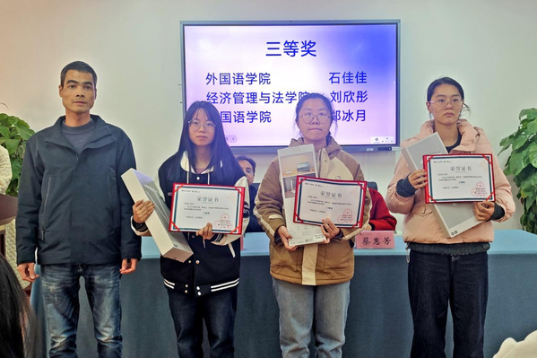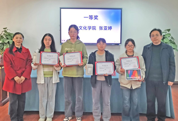 会议宣读了考研高频核心词汇跑酷活动获奖名单。历史文化学院旅游管理与服务教育专业2305班张亚婷获得一等奖,外国语学院英语专业2404班傅心怡等3名同学获得二等奖。在颁奖环节,与会领导老师为获奖同学颁发荣誉证书及奖品,并合影留念。