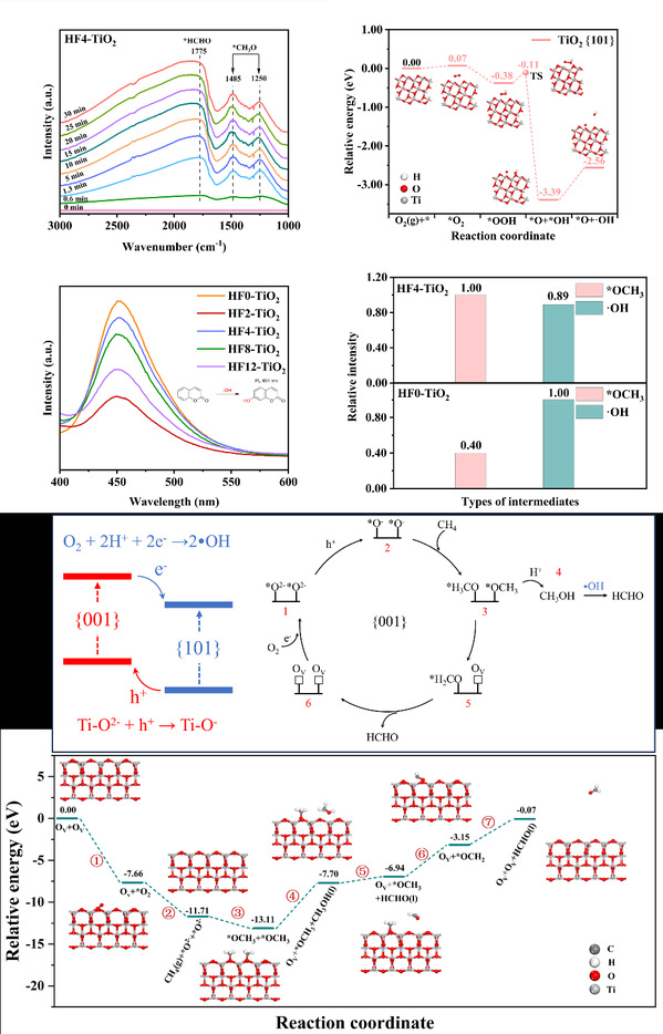 在光催化甲烷转化领域,如何在温和条件下实现甲烷向高附加值化学品(如甲醛)的高效、高选择性转化一直是国际研究前沿与难点。传统热催化路线通常依赖贵金属助催化剂,能耗高、成本大,且易发生烧结和积碳失活;而纯半导体光催化体系则普遍面临光生载流子复合快、反应路径难以调控、产物选择性低等问题。针对上述挑战,研究团队提出并实施了晶面工程策略,在单一锐钛矿TiO2晶粒内精准构筑具有明确界面的 {001}/{101} 晶面结,实现了光生电荷空间分离与反应路径的定向调控。