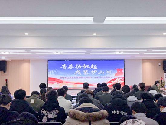 本网讯 12月25日晚,“青春扬帆起戎装护山河”湖北省征兵宣传进校园活动暨2026年征兵启动仪式在武汉纺织大学举行。我校在“一站式”社区总站312会议室设立分会场,黄石市委常委、军分区大校司令员贾宇峰,市征兵办主任、军分区大校副司令员陈高泉,市征兵办副主任、军分区动员处上校处长王震,黄石港区人武部上校部长南小勇,校党委书记李宏,校党委副书记、副校长余涛,党政办,学工部、人武部,各学院分管学生工作负责人及学生代表共同参与。全校17个学院同步设置分会场,组织师生在线观看。