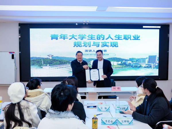 讲座开始前,雷儒金为刘萌颁发“湖北师范大学创业导师”聘书。聘书的授予不仅是对刘萌先生专业能力与行业经验的高度认可,也搭建起学校与行业资源联动的桥梁,为我校创新创业教育注入优质力量。