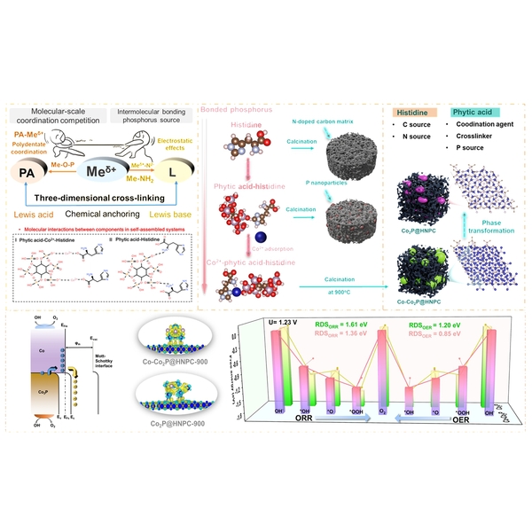 研究提出了一种创新的键合磷源新策略,该方法有效规避了传统共热磷化产生有毒PH3气体、刻蚀磷化反应可控性差的弊端,通过配位吸附作用精准构筑前驱体,成功实现钴纳米颗粒的可控磷化与Co-Co2P异质结的原位相重构,为高性能空气电池阴极材料的合成提供了全新、可放大的工业化策略。