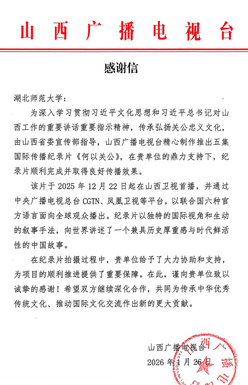 本网讯 近日,学校收到一封来自山西广播电视台的感谢信,信中对我校银龄学者石麟教授在五集国际传播记录片《何以关公》制作工作中,为传承中华优秀传统文化、促进国际文化交流做出的积极贡献表示衷心的感谢。