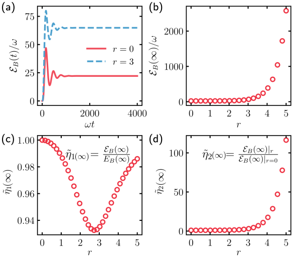 进展二:量子电池作为下一代储能器件,有望利用量子效应实现远超经典电池的存储容量和充电速度。然而,能量回流与环境退相干是制约其性能的两大关键难题。团队提出并系统研究了一种通过压缩库调控大幅提升双模量子电池性能的创新方案。其核心机制是将量子电池与压缩库耦合,有效抑制能量回流,从而显著提升储能总量和最大可提取功。理论结果表明,该方案中储能随压缩参数呈指数增长,并揭示了在库调控下,哈密顿量中常被忽视的反旋转波项对性能的积极贡献。此外,研究建立了压缩库调控策略与主动哈密顿量调控之间的物理等效性。该方案还被扩展至现实条件,包括有限温度、无外部驱动等模型,验证了其鲁棒性和通用性。研究工作为量子电池的性能优化提供了新的方法和研究视角,成果以“Quantum battery via reservoir engineering”(基于库调控的量子电池)为题,发表于Physical Review Applied, 25, 034013 (2026)。论文第一作者为2024级硕士研究生杨瑾,通讯作者为量子光学与量子信息团队熊标副教授。其他作者包括2024级硕士研究生方思博、以及东北大学赵成松博士,量子光学与量子信息团队单传家教授。