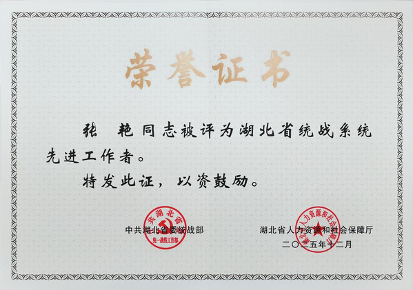本网讯 近日,中共湖北省委统战部、湖北省人力资源和社会保障厅联合发文,表彰一批全省系统先进集体和先进工作者。我校统战部张艳同志获评“湖北省统战系统先进工作者”称号。