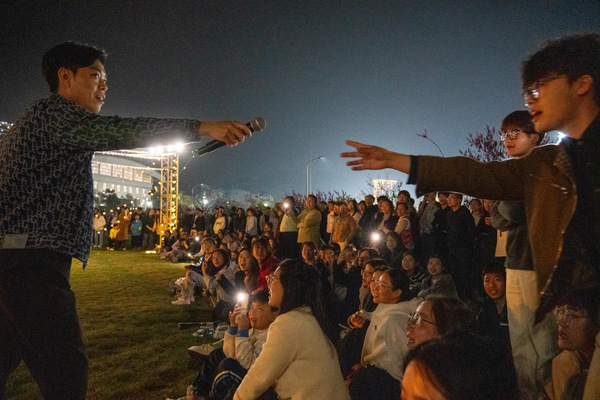 夜幕初垂,活动在“小燕子合唱团”的舒缓歌声中拉开帷幕。灯串缠绕如繁星点点,师生席地而坐挥手合唱,现场洋溢着轻松愉悦的氛围。随后,主持人李季登台,以活泼幽默的语言向现场师生献上诚挚的假日问候,并宣布音乐沙龙正式开始。