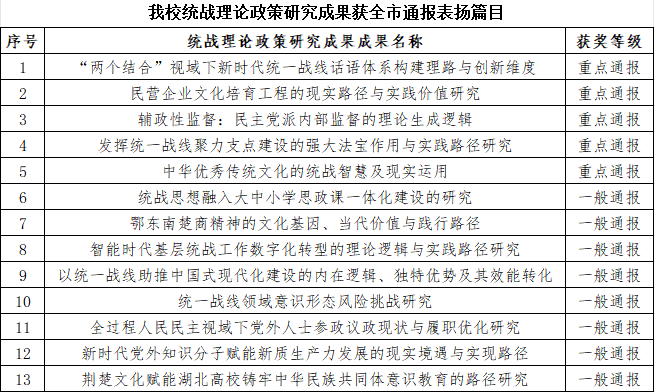 其中,由我校党委统战部报送的统战工作实践创新成果《落实工作机制发挥优势作用以党外知识分子统战工作助力支点建设》荣获2025年全市统战工作实践创新成果(全市4项)。此外,我校共有5篇统战理论政策研究成果获重点通报(全市8篇)、8篇获一般通报(全市17篇)。
