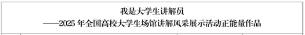 近日,“我是大学生讲解员 —2025 全国高校大学生场馆讲解风采展示活动” 评选结果揭晓。湖北师范大学马克思主义学院学生韩维怡凭借以黄石红军楼为主题的讲解作品《挺膺担当筑新篇 光耀千秋长征魂》,成功获评2025 年全国高校大学生场馆讲解风采展示活动正能量作品,展现黄石青年学子传承红色基因、讲好红色故事的青春风采。