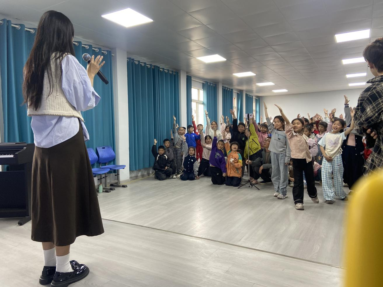 演出过程中,音乐会特别设置了动漫主题曲问答互动环节,研究生与孩子们积极互动,现场氛围热烈欢快,既拉近了孩子们与音乐的距离,也将整场音乐会推向高潮。