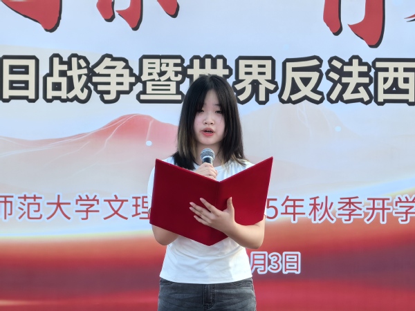 升旗仪式上学生代表陈思雨以“铭记抗战精神,共筑学风长城”为主题作国旗下演讲,她表示,回望中国人民抗日战争与世界反法西斯战争岁月,无数青年以学为战、以志为矛、用知识与信念筑牢救亡图存的防线。这份“勤学救国、励志担当”的精神,正是我校“勤学、善思、励志、诚信”学风的深层底色。她向全体同学发出倡议,如今的我们更要不断加强学风建设,以实际行动在民族复兴的伟大征程中书写青春篇章。